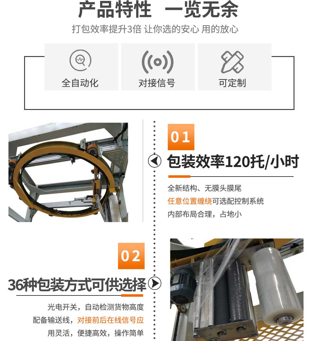 配有傳輸線 操作系統(tǒng),高效簡單 多達36個包裝選項可供選擇 應用靈活,方便高效 光電開關檢測貨物高度 為企業(yè)節(jié)約包裝成本 包裝方式可任意選擇 允許薄膜防止薄膜松動 速度更快,使用更安全,故障率幾乎為零 環(huán)體采用獨特設計,使用壽命更長 自動送膜夾膜,自動焊膜,無膜尾 |