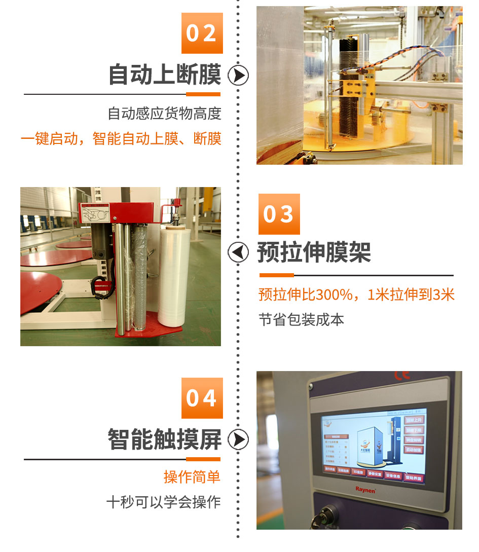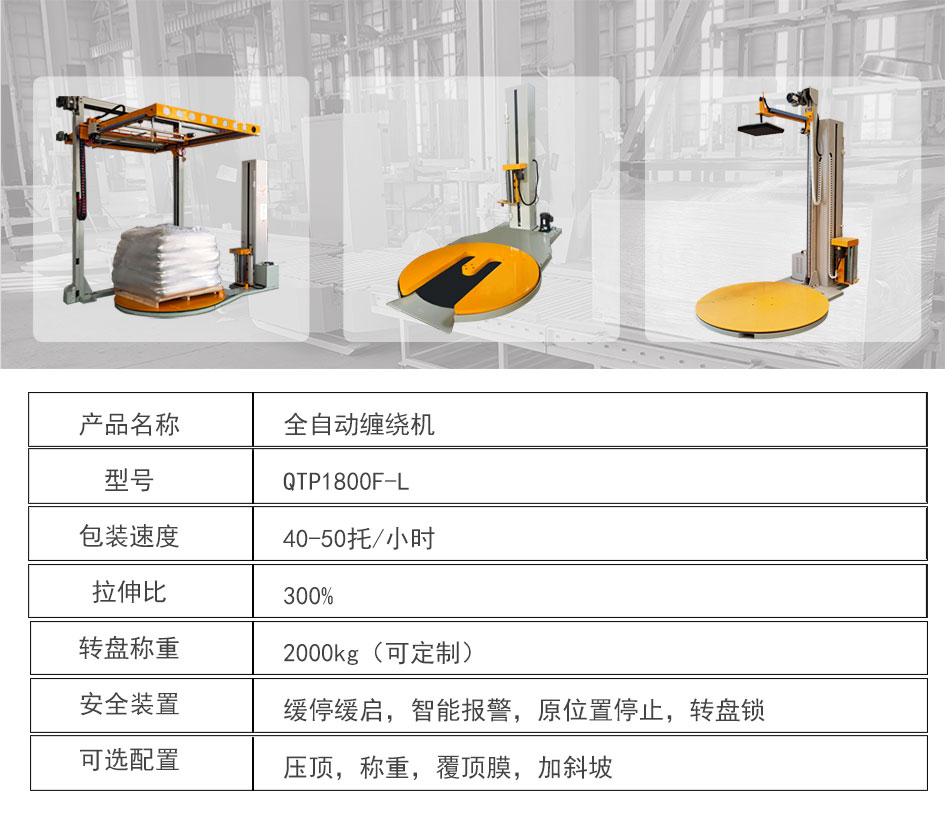 大宏佳森全自動遙控纏繞機QTP1800F-L采用全自動上斷膜裝置,搭配遙控裝置,操作員無需下叉車,