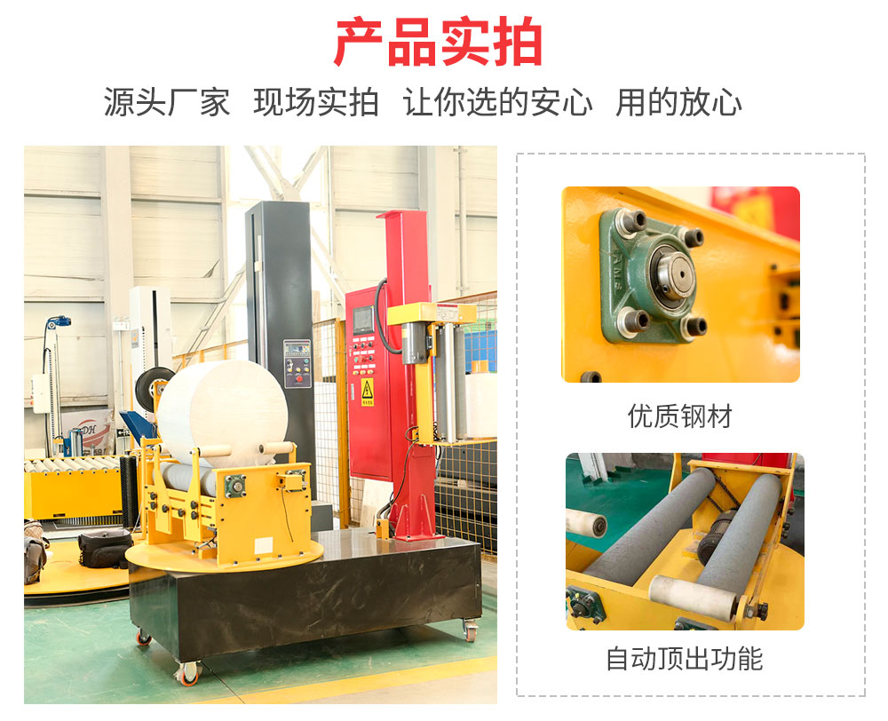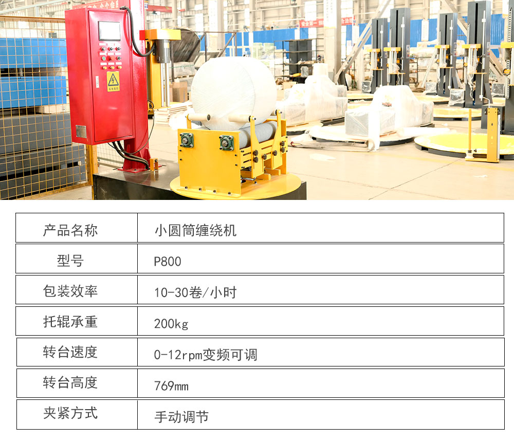 大宏佳森小圓筒纏繞機P800,圓筒類貨物全裹包設(shè)備主要適用于圓筒狀物體的軸向包裝,實現(xiàn)貨物360度的整體裹包。如無紡布、簾子布、線圈、橡膠制品及造紙(品)等的包裝。其特點:輕巧、靈便、操作簡便。同時可根據(jù)包裝的實際需要,選用自動頂出型、壓頂型、圓筒托盤兩用型、自動在線型等設(shè)備。