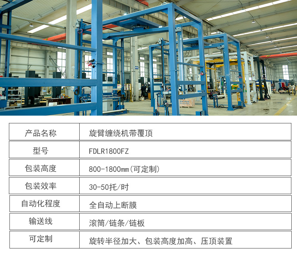 大宏佳森旋臂纏繞機帶覆頂FDLR1800FZ主要適用于生產(chǎn)量大、包裝效率較高的現(xiàn)代化作業(yè),包裝成本低、效率高滿足貨物的包裝要求。可根據(jù)不同的產(chǎn)品和現(xiàn)場的實際需求,定制不同的包裝系統(tǒng),自動完成貨物的感測、包裝輸送等全過程,輸送系統(tǒng)可采用滾筒、鏈條、鏈板等不同的形式,自動上斷膜機構可實現(xiàn)無人化操作。廣泛應用于食品、飲料、化工、造紙、建材等行業(yè)。