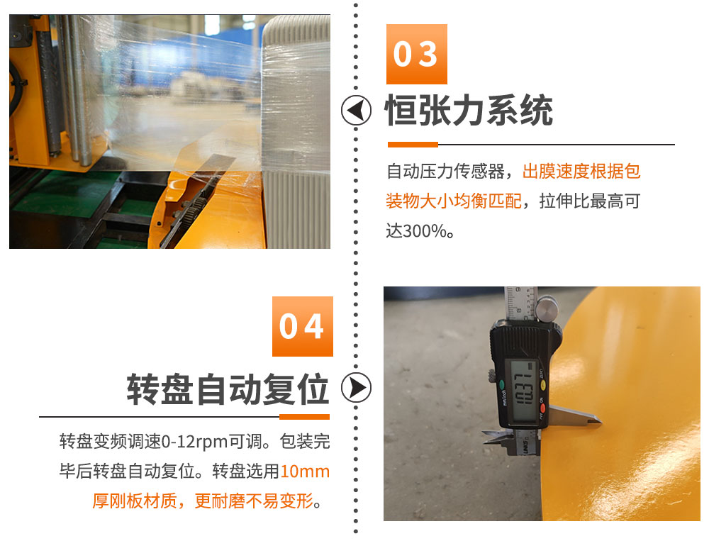 能有效避免因轉(zhuǎn)盤旋轉(zhuǎn)而導致貨物甩出。保證貨物在包裝過程中平穩(wěn)。