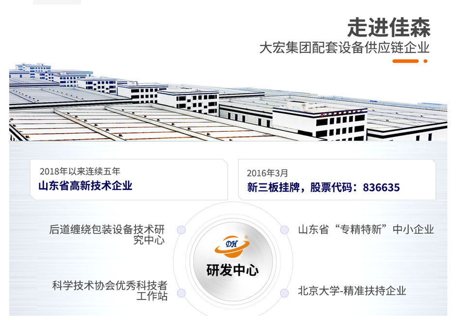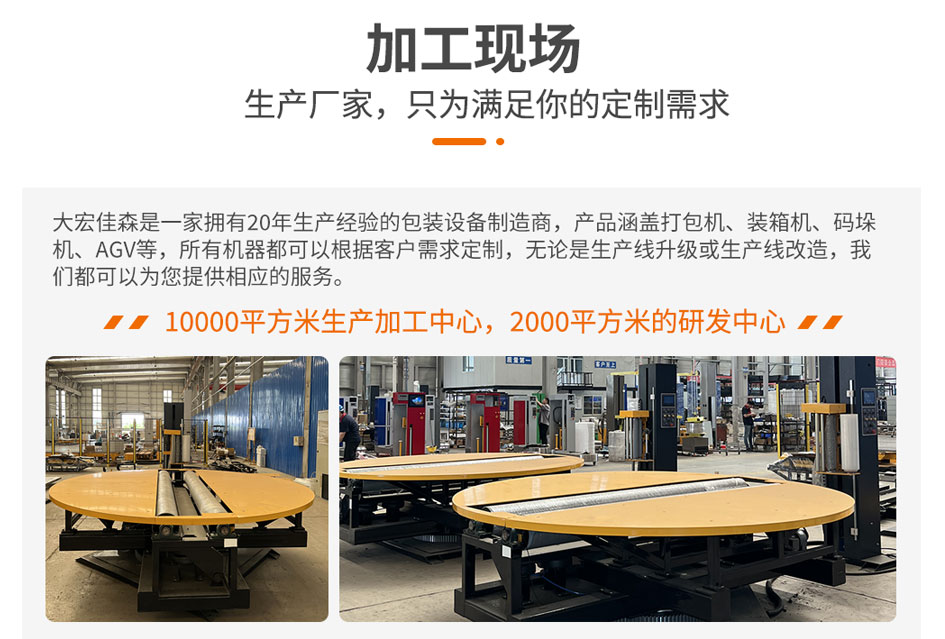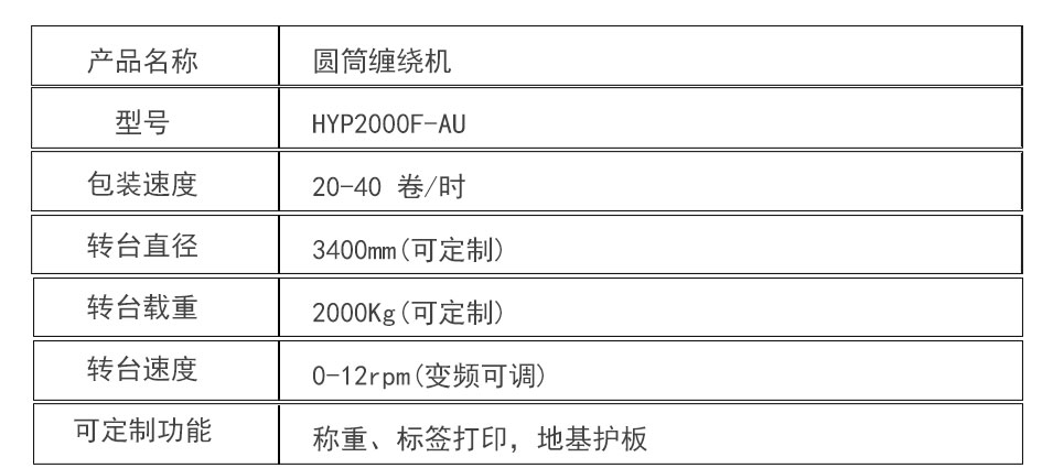 大宏佳森圓筒纏繞機HYP2000F-AU,包裝機采用PLC自動控制,性能可靠,可根據(jù)需要改變纏繞方式和次數(shù);轉臺自動復位,保證貨物進出定位準確;用戶可選擇拉伸或預拉伸薄膜裝置;根據(jù)客戶需求,選配光電控制頭,自動測高;根據(jù)需要設計制造配套生產線。